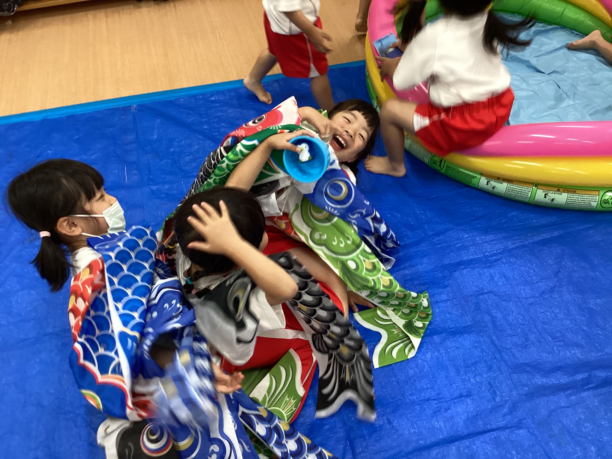 紙芝居で体験した物語の影響でこいのぼりへの興味が出たため、巨大こいのぼりの取り合いになっています。このように、遊びの前に何をするか、子どもに何を体験させるかで、遊びの方向性が大きく変わってくるわけです。