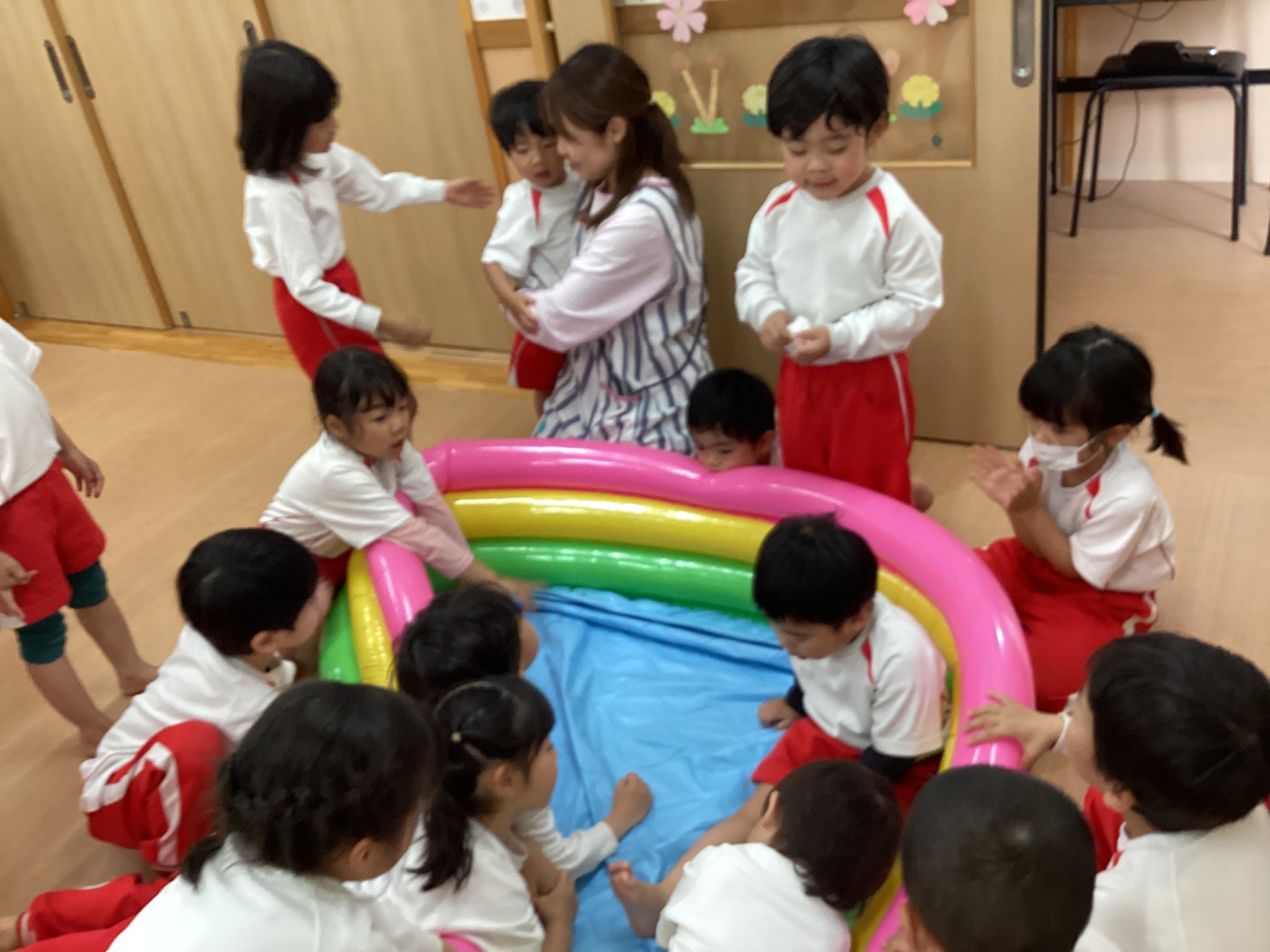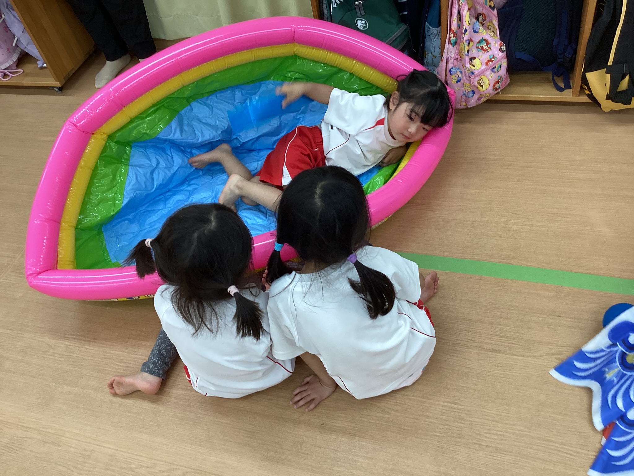 3歳児たちはヤドカリのようにプールの下に入り込む遊びに夢中。前回、4歳児が行なっていた遊びです。遊びは回を重ねると下の学年に降りてくる。
