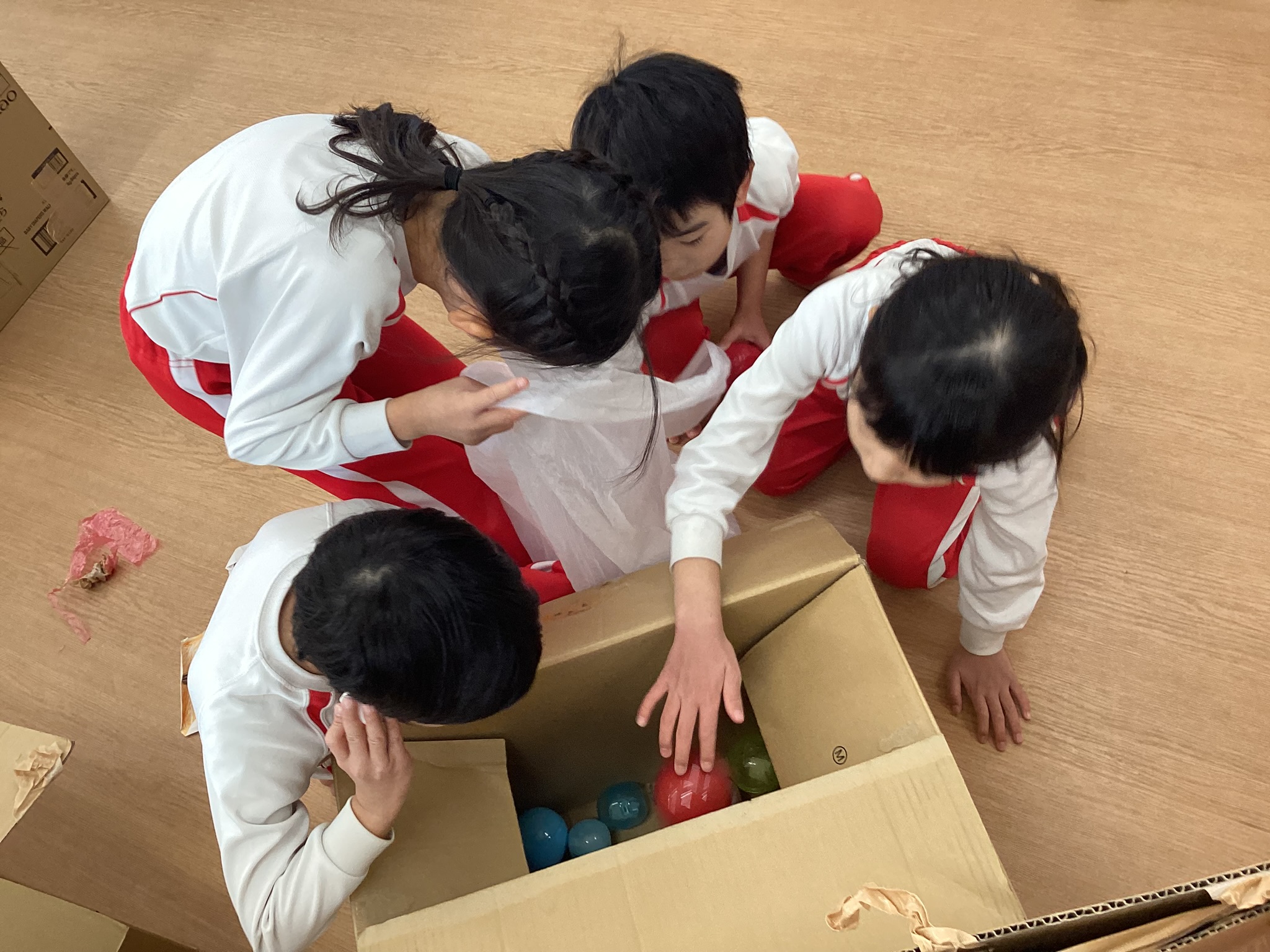 カプセルトイのボール。誰のものというわけでもなく、みんなで考え、修正していく。女の子たちが作っていたものですが、最終的にどうするか男の子たちと一緒にアイデアを出して決めていきます。