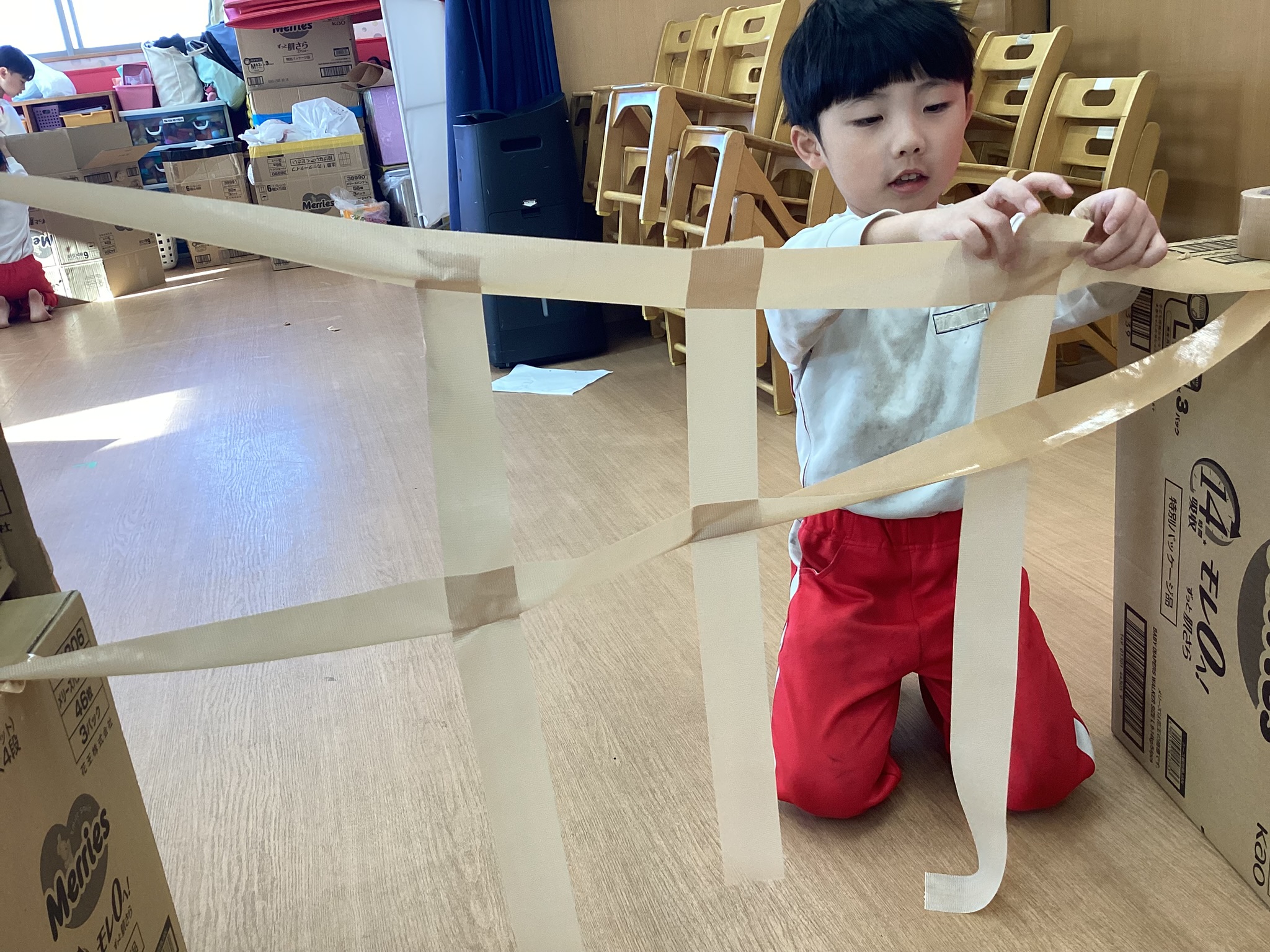 ガムテープで蜘蛛の巣を表現。1人が始めると、みんな良いアイデアは吸収し、真似していく。壁が足りないので、ガムテープの蜘蛛の巣を活用してコースを作っていきます。