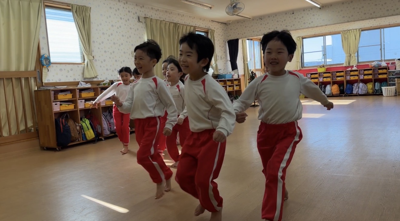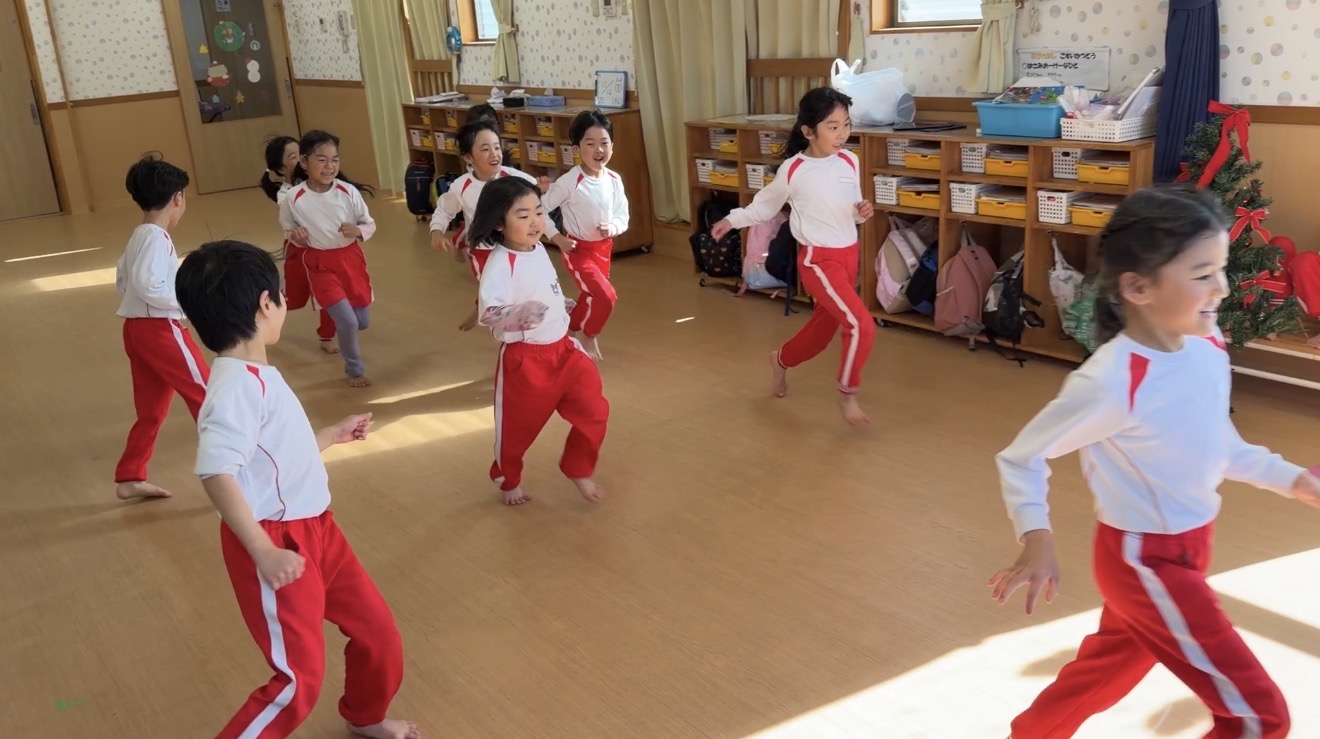 続いて4歳児。4歳児は嬉しいと走り出す。楽しさを体で表現しています。運動会の時のように。